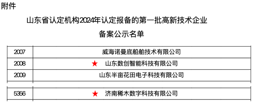 山东数创智能科技有限公司连续斩获山东省瞪羚企业、高新技术企业(复审)等资质荣誉,子公司济南稀木数字科技有限公司亦获高新技术企业认定。