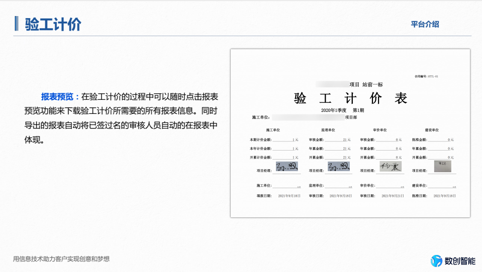 验工计价管理系统包含验工计价、考核管理、安全生产费、投资计划、产值统计、合同管理、基础资料、用户中心8大业务模块,共计100余个功能,覆盖了项目验工计价流程全生命周期。通过网络信息化的方式,将所有的数据信息都通过网上进行处理流转,保证了数据的时效性和安全性,极大地节约了时间成本。为验工计价数字化提供技术保障。